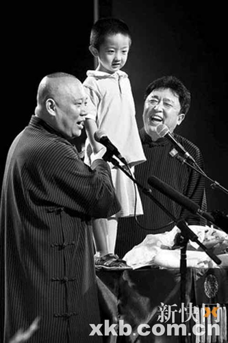 整場(chǎng)演出持續(xù)了近4個(gè)小時(shí),全場(chǎng)笑聲、掌聲、喝彩聲不停,觀眾都說(shuō)這次壓軸出演的老郭很“給力”。被要求返場(chǎng)后,郭德綱竟然把云字輩最小徒弟、于謙的兒子抱上桌子,用巧克力引誘他唱曲。結(jié)果小家伙上來(lái)就自選了一段《我是一個(gè)兵》,老郭又借著表示誰(shuí)侵略我們就給打過(guò)去,還和小家伙合唱了一句太平歌詞。