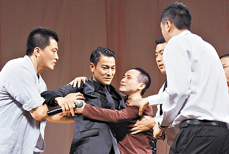 中新網(wǎng)9月21日電 電影《通天神探狄仁杰》前晚在北京大學(xué)舉辦首映,劉德華(華仔)、劉嘉玲、李冰冰、梁家輝都到場(chǎng),活動(dòng)進(jìn)行到一半,有位男粉絲竟沖上臺(tái)熊抱華仔,被保安強(qiáng)行拉下臺(tái),華仔見狀連忙斥喝保安,要他們動(dòng)作不要太粗暴,展現(xiàn)巨星風(fēng)范。