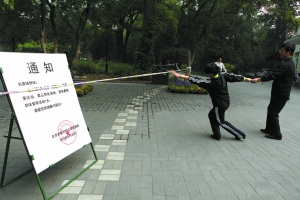 在公園門口和警戒線旁,均貼出落款為公園管理處的通知:“因公園9月25日有重要活動,需占用此場地,望各晨練群體暫;顒1天”,通知中的時(shí)間部分有被白紙粘貼的痕跡。