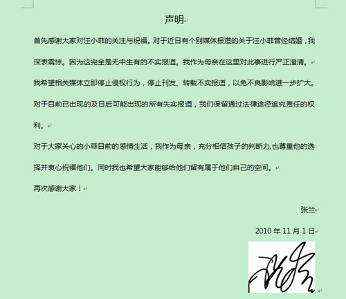 中新網(wǎng)11月2日電 近日,有消息稱大S未婚夫汪小菲曾離婚,并有一女,對此,汪小菲母親、俏江南董事長張?zhí)m女士對其子汪小菲已婚離異的不實報道發(fā)出聲明。內容如下: