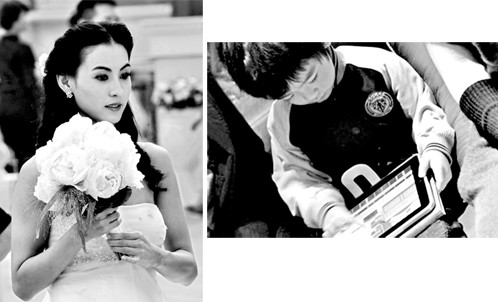當天拍攝的是《最強囍事》中的重頭戲:搶親。杜汶澤好不容易將張柏芝追到手,哪知就在婚禮即將舉行的一刻,對張柏芝情深意切的古天樂突然出現在現場,不由分說就要將張柏芝搶走。一見身披婚紗的張柏芝,就不由令人想起她和謝霆鋒的幸福婚姻生活。提起謝霆鋒,張柏芝立刻就笑了,甜蜜表示:“霆鋒來探班過,但因為有戲在身,才呆了15分鐘就走了!彪m然只有15分鐘,但對于張柏芝來說,已經很是滿足。張柏芝坦言,那么多年沒有拍戲,剛剛站到鏡頭前的一刻,確實有些不習慣和緊張,還好有老公在身邊支持自己:“他是很靦腆的人,在片場話雖然不多,已經是很關心的舉動了,我很開心!