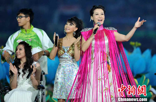 中新網(wǎng)12月13日電 與在海心沙舉辦的亞運(yùn)會(huì)開(kāi)幕式上強(qiáng)烈的視覺(jué)沖力和明星云集不同,12日晚在廣東奧林匹克體育中心上演的亞殘運(yùn)會(huì)開(kāi)幕式則充滿(mǎn)了溫暖和關(guān)愛(ài)。文藝表演環(huán)節(jié)中,除了400多位殘疾人媽媽團(tuán)和300多個(gè)殘疾演員用手語(yǔ)帶領(lǐng)6萬(wàn)名觀眾進(jìn)行愛(ài)的表達(dá)震撼全場(chǎng)之外,一位特殊的明星創(chuàng)紀(jì)錄的三次出場(chǎng)給觀眾帶來(lái)了不同的驚喜和感動(dòng),她就是著名歌唱家、廣州亞運(yùn)會(huì)宣傳大使——譚晶。