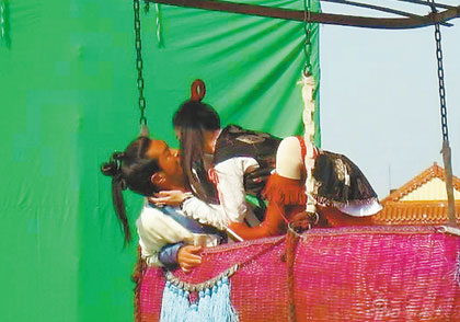 記者前往探班的一場戲,是該劇最后一幕:古天樂和大S經(jīng)歷種種波折終于走到了一起,在古天樂用風(fēng)箏和竹筐連成的“熱氣球”里度過浪漫時(shí)光。由于過于浪漫,大S演的俠女便起了“色心”,于是發(fā)生了強(qiáng)吻這一幕。