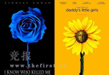 簡(jiǎn)單的畫面,開(kāi)得正旺的鮮花上若隱若現(xiàn)著一張臉,干凈利落。不過(guò)不要以為換了顏色,我們就看不出了。當(dāng)然,黑底藍(lán)花渲染了《我知道誰(shuí)殺了我》的恐怖氣氛,向日葵讓《爸爸的女兒》溫暖的主題更深入人心。