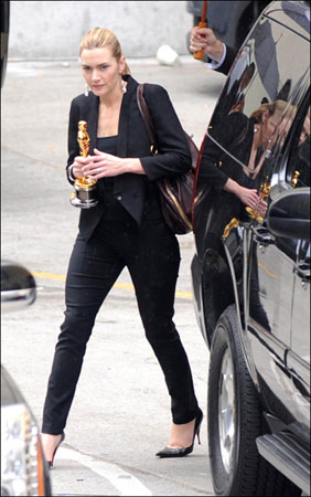 凱特·溫絲萊特對于自己的奧斯卡影后的稱號也是相當激動,下面小編給大家?guī)硪唤M圖片,大家可以看到,影后拿著小金人一直不肯撒手,生怕碰壞,可以看得出她是多么重視這個獎項了吧。順便說一下影后的穿著,一身黑色職業(yè)性濃厚,干練的盤發(fā)透出影后的氣勢。