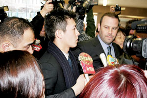2:20開庭。陳冠希在律師陪同下出庭,由數(shù)名彪形大漢保護(hù),現(xiàn)場(chǎng)沒有接受任何媒體采訪