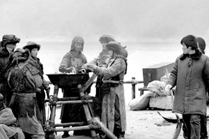 記者昨日在現(xiàn)場看到,每當拍戲的間歇,演員們就三五成群地圍到行軍火盆旁邊烤火、聊天。還有的演員扭在一起摔跤,以運動來增加熱量。