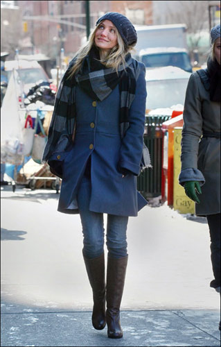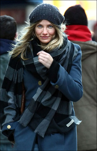 卡梅隆·迪亞茨這位高挑美女,這次頭帶藍(lán)色大號毛線帽子,身穿藍(lán)色呢子大衣,就像是一個可愛性感的大娃娃。但是好像臉上的皺紋稍微多了點,看來卡梅隆·迪亞茨要好好保養(yǎng)自己的臉蛋了。