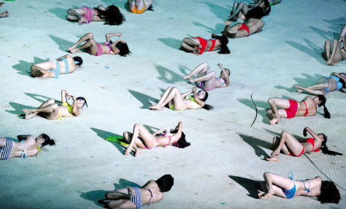 “印象沙灘”是整場演出中最“養(yǎng)眼”的一幕。剛開始,兩個穿著短裙的姑娘跑到舞臺中央,一陣狂舞之后,兩人突然豪放地當(dāng)著全場觀眾的面,脫下短裙,露出性感的三點(diǎn)式泳衣。觀眾還來不及驚呼,更多的三點(diǎn)式美女出現(xiàn)了,先是十幾個,后來是上百個……滿場都是!她們朝著觀眾席大喊:“我們是海南島的姑娘!我們很年輕!我們很漂亮!” ……