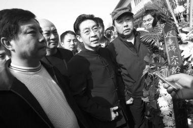 上午10點(diǎn)告別儀式開始,人們排成長(zhǎng)隊(duì)井然有序地進(jìn)入靈堂。閆懷禮的遺體安臥在花叢中,面容安詳!吧窕觌x去芳名百世著清風(fēng),音容宛在勤奮一生傳佳話”的挽聯(lián)十分醒目。靈柩旁,六小齡童、遲重瑞、馬德華等《西游記》主創(chuàng)垂淚站立。當(dāng)《西游記》主題曲《敢問(wèn)路在何方》在靈堂響起,眾人嗚咽聲一片。
