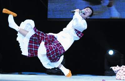 經過近2小時的“溫場”后,小沈陽終于壓軸登臺亮相。一看到身穿標志性的紅格子“蘇格蘭”服,背著小挎包的小沈陽從后臺走出來時,觀眾紛紛尖叫著起立。久候在舞臺邊的一群女粉絲手捧鮮花,欲沖過保安防線上前獻給偶像!皩ξ业姆劢z要客氣哦!”小沈陽金口一開,粉絲們立即突破了防線沖上臺去,有女粉絲獻過花后再來一個熊抱,后面的女粉絲更是“搶吻”小沈陽,“陽仔(小沈陽小名)我愛你”的真情表白更在劇場內此起彼伏,看來小沈陽的“女人緣”極好。