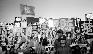 久未露面的陳楚生讓現(xiàn)場歌迷激動不已,分布在看臺上各個角落的上百位“花生”始終舉著“陳楚生”、“楚”的牌子,并且喊著整齊的口號,為陳楚生助陣。