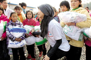 翁虹與丈夫是“中國(guó)社工協(xié)會(huì)(兒童希望)救助”的形象大使。上周,他們與志愿者們一起將棉衣、棉被等過(guò)冬物資送到四川省綿陽(yáng)市一些災(zāi)民手中,并提前跟孩子們過(guò)年。