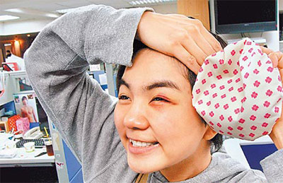 她左眼立刻腫起及嚴(yán)重瘀青,她回家后不斷冰敷,還慶幸:“只差一點(diǎn),就打到眼球,好險(xiǎn)!”樂(lè)觀的她昨進(jìn)所屬華研音樂(lè)辦公室,還大喊:“快來(lái)看團(tuán)團(tuán)圓圓,來(lái)我這里看貓熊免排隊(duì)喔!”不過(guò)她現(xiàn)在最擔(dān)心周五預(yù)定要拍廣告,目前左眼的瘀青沒(méi)把握來(lái)得及消褪,華研表示若屆時(shí)傷勢(shì)未痊愈,只好跟廠商協(xié)調(diào)延期拍攝。