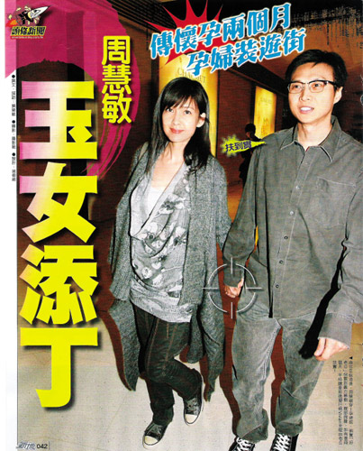 據昨日出版的某香港周刊爆料,周慧敏近日出席活動時被發(fā)現肚子凸起疑似有喜,而上周該周刊記者又在街上撞見她身穿孕婦裝偕夫出游,似乎新婚不足兩個月已“好事成雙”。有傳言指,原來在“倪震濕吻事件”發(fā)生后不久,周慧敏已發(fā)現自己“有喜”,這才是令倪震戲劇性浪子回頭的最大原因。