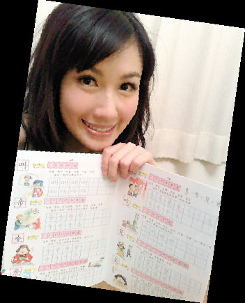 李詩(shī)韻從小就在加拿大讀書(shū),雖然回香港做了5年的演藝工作,已經(jīng)能看懂70%的中文,但是會(huì)寫(xiě)的漢字不足200個(gè),平時(shí)寫(xiě)博客也需要麻煩同事幫忙。從她博客上的圖片可以看到,練習(xí)冊(cè)上歪歪斜斜地寫(xiě)著“門(mén)”、“房”、“橋”等字,目前只相當(dāng)于一年級(jí)學(xué)生的水平。