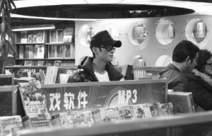 解約官司纏身的陳楚生當(dāng)天身穿黑色羽絨服,黑色帽檐拉得很低,腳穿白色休閑鞋,靜靜地站在顧客中看書并不是很顯眼。起初正在看碟的記者并沒有注意到陳楚生,直到迎面走過時才認(rèn)出他。