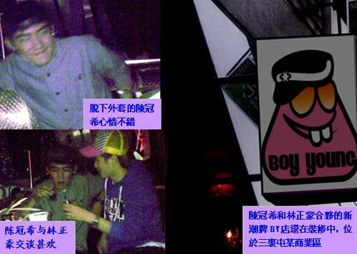 記者隨后跟出門口,卻不見陳冠希一行身影。而他們的奔馳座駕一直停在車位,約凌晨2時許,才見三名保衛(wèi)人員隨同之前陪著陳冠希看商鋪的韓國華裔富家林正豪出來,而后打開車門,拿了什么東西,而后又回到酒吧。記者注意到,該富商一直有保衛(wèi)人員跟隨,而且當晚一直陪同陳冠希,看來關系非同一般。此外,記者輾轉(zhuǎn)從酒吧大堂經(jīng)理處了解到,與陳冠希同行的林正豪乃韓國上流社會頗有影響力的華人企業(yè)林氏株會社貴公子,早年一直玩轉(zhuǎn)韓國時尚圈,近年也當歌手出唱片,可謂是橫跨時裝和娛樂兩界,不僅擁有韓國頂尖潮流服裝品牌,還是韓國某娛樂公司的幕后老板,而當晚夜店老板早就安排了陳冠希一行到來的保衛(wèi)工作。大堂經(jīng)理透露,這位韓國華裔富家林正豪也是他們老板的好朋友,此行除了陳冠希外,還有京城某地產(chǎn)商之女以及圈內(nèi)某著名女制片人之子,“身家都是上億的。”