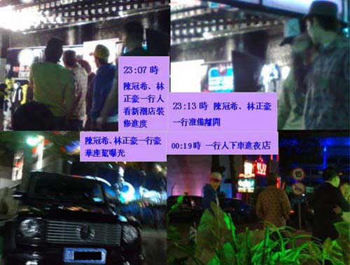 而后記者進入酒吧。尋找陳冠希一行的身影。終于在位于舞池后方的一玻璃狀敞開式包廂內(nèi)發(fā)現(xiàn)了陳冠希的身影。此時的陳冠希已經(jīng)脫下外套,里面是一件灰色襯衫,還有一件T-SHIRT,伴著昏暗的燈光的嘈雜的音樂,和坐在身邊的林正豪開始碰杯喝酒。而這個包廂周圍,至少有6個安全人員把守。但這樣的放松僅僅持續(xù)了不過幾分鐘,突然,一新朋友走進包廂,陳冠希立即站立起來握手,但這一站立,立即讓鄰近包廂的兩女孩子異口同聲驚叫“啊,陳冠!保缓笕巳褐虚_始涌動過來,眼看身份暴露,陳冠希一行立即起身在保安的簇擁下突然消失了。
