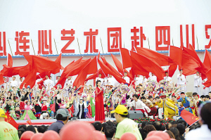 前天上午,為了讓更多的災區(qū)人民以及援建志愿者看到演出,“心連心”藝術團專門派出兩支小分隊赴德陽東汽新址以及北川擂鼓鎮(zhèn)舉行分會場表演,而昨天上午,主會場的演出則在綿竹上演,上萬觀眾觀看了演出。而央視著名主持人趙忠祥、畢福劍、徐俐、韓喬生、李瑞英、王小丫、鞠萍、馬東、朱迅等名嘴擔綱主持并反串了精彩節(jié)目。孫悅、韓磊、湯燦、張邁、陳小濤等近百位明星為災區(qū)群眾獻藝。這樣的陣容的確如之前報道的一樣,“超過春晚”。許多災區(qū)群眾感動地說:“央視心連心藝術團,在地震周年到災區(qū)演出,確實把溫暖送到了我們心里,讓我們對重建家園更有信心”。