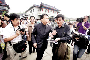 9點10分左右,常寶華、劉惠等人紛紛從側(cè)門離開,被群眾和媒體以包夾之勢分別圍住。