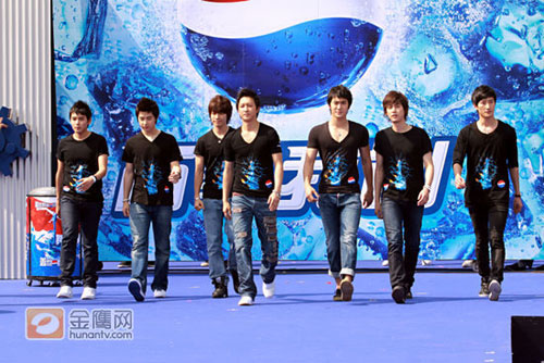 新加盟成員SJ-M先聲奪人,如古代騎士般在塔樓尖上出現(xiàn)的他們立刻引起了在場歌迷的陣陣尖叫。而后古天樂、蔡依林、李準基、羅志祥、黃曉明在印有該品牌標識的大卡車頂緩緩出現(xiàn),12位成員當場在臺上互相潑水取樂,宛如畫面。