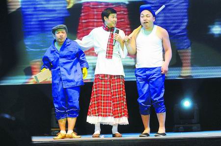 晚9時(shí)40分許,全場(chǎng)響起最熱烈的掌聲和叫好聲,“小沈陽!陽仔出來了”的叫喊聲此起彼伏。這次小沈陽雖然還是一身蘇格蘭裝扮,但頭上沒有發(fā)卡,手上的女士花包幾乎沒上過肩,聲音也變得陽剛起來,只在調(diào)節(jié)氣氛時(shí)偶爾用一下他擅長(zhǎng)的“嚎”音,儼然有轉(zhuǎn)型的味道。接下來的約40分鐘,不管是中國(guó)足球的笑話、還是翻唱《大!返龋瑘(chǎng)面上熱鬧非常,但關(guān)注小沈陽的人會(huì)發(fā)現(xiàn),這些東西他已經(jīng)演過很多遍了!