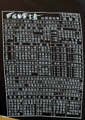 記者從這份泄密的拍攝通知單上發(fā)現(xiàn):今天拍攝的將主要是張三(孫紅雷)和李四(小沈陽(yáng))之間的對(duì)手戲,其余人物還有王五、趙六以及陳七、老板娘、巡邏隊(duì)、波斯商、人胭脂、店伙計(jì)。拍攝道具則包括旱煙、馬車、火鐮、搭囊、火筒彈藥、弓箭、腰刀等,另有駱駝以及馬12匹?磥(lái)今天拍攝的大部分都是外景。有意思的是,這張拍攝通知單上還有一條“特殊道具提示”:油潑辣子、烙鍋盔用發(fā)面,扯面用軟面。而午餐現(xiàn)場(chǎng)是145份,說(shuō)明這個(gè)劇組規(guī)模還是不小。細(xì)心的工作人員還注明:“住地病號(hào)一人:小米棗粥搓魚面片。”看來(lái)之前所傳劇組伙食不錯(cuò)的消息果然不假。