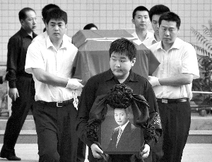 追悼會現場,水晶玻璃棺材四周布置著上萬朵百合花、白玫瑰花,靈堂肅穆安靜,羅京身著黑色西服、彩色領帶,遺態(tài)安詳。羅京妻子、愛子,以及所有親屬排成一列,陪伴羅京走完最后一程。羅京的妻子面容憔悴,低頭不語。靈堂外挽聯(lián)橫批“沉痛悼念羅京同志”。由于現場前來的群眾太多,工作人員不得不細心地提醒大家,“咱們就不鞠躬了,看一看羅老師就走,謝謝大家配合。”