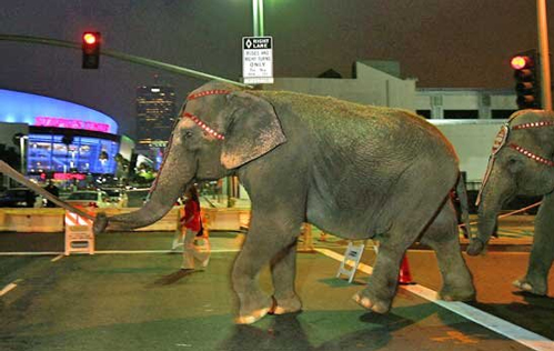 為了杰克遜追思會(huì),參加游行的11頭大象,7匹馬,老虎,斑馬,小馬和狗被存放在洛杉磯斯臺(tái)普斯中心后臺(tái)5天,