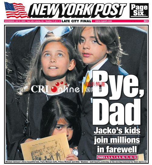 2009年7月9日訊,洛杉磯,當(dāng)?shù)貢r(shí)間7月7日,流行音樂(lè)之王邁克爾·杰克遜(Michael Jackson)的公眾悼念儀式在美國(guó)洛杉磯的斯臺(tái)普斯體育中心舉行。當(dāng)?shù)貢r(shí)間7月8日,《紐約郵報(bào)》把杰克遜三遺孤的合影當(dāng)做封面,孩子們泛紅的眼圈,哀傷的神情令人心酸。