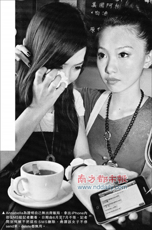 據(jù)香港周刊報(bào)道,有目擊者稱見到22歲的口靚模A nnabella(羅靖希)和好姐妹A sa(關(guān)紫藍(lán))進(jìn)入灣仔某酒店,疑似陪客吃飯。當(dāng)港媒向A nnabella求證此事時(shí),她激動(dòng)否認(rèn)傳聞稱自己沒有去過“不三不四”的飯局。A nnabella表示的確收到過淫媒的短信,但未答應(yīng)“我們敢發(fā)誓沒有做過(飯局陪客),也沒有給他們電話”,淫媒因此還發(fā)信息罵她:“不要再純情扮潔身自愛了!”為證明清白,她還公開淫媒發(fā)來的短信,內(nèi)容包括“今晚灣仔道N ight Club有客6000快覆”、“請覆機(jī)去不去,加到一萬上房”等等。