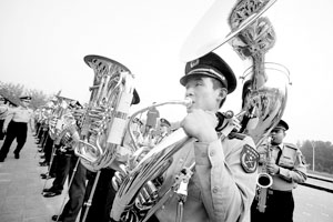 在即將到來的國慶60周年閱兵和群眾游行活動中,他們是最為特殊的一支隊(duì)伍:第一個入場,最后一個離場;不受檢閱,但用45首樂曲 (部分曲目重復(fù))控制著整場慶典的節(jié)奏。