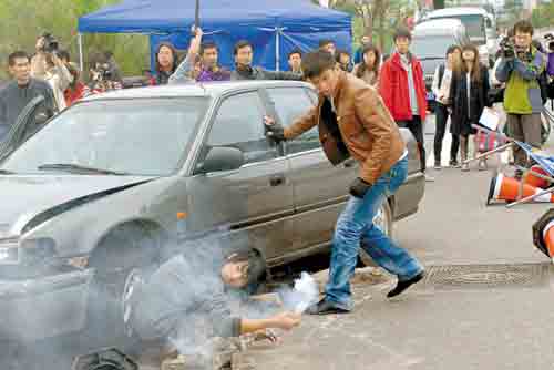 最驚險(xiǎn)的一幕是車輛爆炸之時(shí),雖然整部汽車都燃起了熊熊大火,卻未出現(xiàn)零件炸飛的情況。爆炸的道具十分簡單,是劇組自制的“汽油彈”———在幾個(gè)空瓶內(nèi)裝滿汽油,外加少許甲胺磷農(nóng)藥或白酒等物品,與幾個(gè)小“魚雷”捆綁在一起就能“爆炸”了。(記者 章琰)