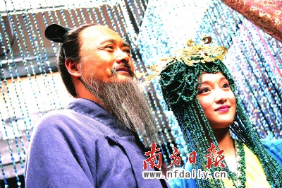 昨天下午5時左右,在涿州影視城戰(zhàn)國城內(nèi)的一座大殿里,“子見南子”的戲正式上演。幽暗的大廳里擺設(shè)著8座戰(zhàn)國時常見的犧尊造型的琉璃紗燈,褐色的紗帳從梁上垂下。而由奚仲文打造的演員服裝更是讓人眼前一亮:扮演孔子的周潤發(fā)身穿青灰色麻布長袍,頭戴同顏色的儒士巾,看起來極為樸實(shí)。而周迅扮演的南子則一身水藍(lán)色的長裙,顯得雍容華貴。周迅頭頂?shù)慕鹕P冠和同樣水藍(lán)色的頭飾,據(jù)說是由松綠石串成,因此非常沉重。在第一次試戴的時候,周迅甚至抬不起頭來, 需要有人在后面幫忙才能正常行走。