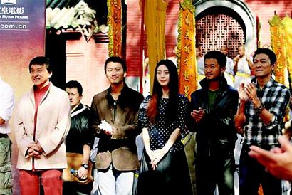 昨日現(xiàn)場,在成龍、劉德華、謝霆鋒、范冰冰等明星悉數(shù)亮相后,現(xiàn)場的嘉賓和武校的學(xué)生們都紛紛圍上去想和偶像近距離接觸,場面一度失控。成龍一出場就發(fā)揮他的“大哥”本色,呼吁現(xiàn)場人士維持秩序,而劉德華也呼吁大家小心安全!缎律倭炙隆吩诮衲瓿蹙鸵呀(jīng)開始籌備,在確定了成龍、劉德華二位影壇巨星加盟之后,女主角卻遲遲定不下來。曾經(jīng)一度傳出張柏芝、周迅等多位一線女星爭相加盟,競爭異常激烈。昨日范冰冰的出現(xiàn),結(jié)束了女主角的懸念。