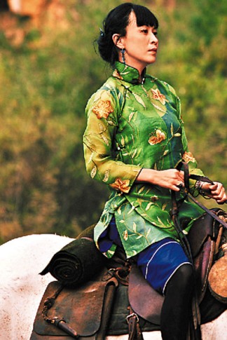至于葛優(yōu)的造型亦隨嘉玲所飾演的夫人雙雙曝光。長發(fā)及肩、戴著帽子、外形十足老夫子的葛優(yōu),扮相詼諧,加上一臉落荒而逃的滑稽模樣,落難味十足,與戲中劉嘉玲一身翠紗花褂短打,配緊身馬褲,策馬而騎的英姿相映成趣。