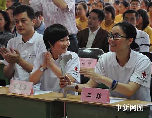 五月十一日上午,由王菲、李亞鵬夫婦等護(hù)送的三位災(zāi)區(qū)孩子返回北川家鄉(xiāng),這是“汶川新家庭”助養(yǎng)計(jì)劃的第一批孩子。圖為王菲、李亞鵬夫婦和他們救助的北川中學(xué)學(xué)生朱春燕(右)合影。 中新社發(fā) 唐偉杰 攝