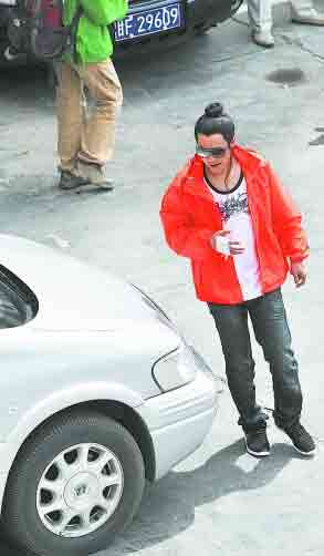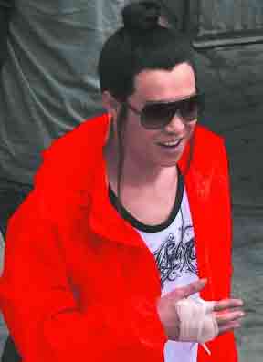 小沈陽穿著一件鮮亮的橙色外套,里面是一件隨意的白色T恤,臉上已經(jīng)化好妝,戴著墨鏡,而不是大家常見的黑框眼鏡,乍一看還真有點認不出來。小沈陽的古裝頭套已經(jīng)戴好,只是一個簡單朝上梳的發(fā)髻,不過鬢角兩側(cè)還特地留了兩縷長長的頭發(fā)。記者一眼就發(fā)現(xiàn),小沈陽的右手不自然地舉在小腹前,還用白色的紗布進行了包扎,肯定是受傷了。不過小沈陽的心情看上去好極了,他先是哼歌,后來見記者追問拍戲感受,他便取下墨鏡,反問記者是哪里人,不過面對“第一次和張導拍戲的感覺怎么樣”的問題,小沈陽只是微笑,并不回答。