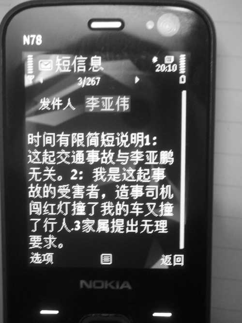 昨天,李亞偉接受了本報(bào)記者的采訪,針對(duì)“車禍門(mén)”事件,他給記者發(fā)來(lái)短信表明態(tài)度——1:這起交通事故與李亞鵬無(wú)關(guān)。2:我是這起事故的受害者,造事(應(yīng)為肇事)司機(jī)闖紅燈撞了我的車又撞了行人。3:家屬提出無(wú)理要求。