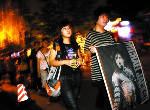 昨晚,歌迷手持邁克爾·杰克遜的照片繞后海行走,悼念這位樂壇巨星。美國流行樂壇巨星邁克爾·杰克遜25日因心臟病發(fā)作在洛杉磯一家醫(yī)院不治身亡,終年50歲。為確認(rèn)杰克遜的死因,洛杉磯驗尸官今日將進行尸檢。