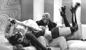 上周六播出最新一集SNL,年過半百的娜姐跟比她年輕一半的Lady Gaga,兩人穿著皮制內(nèi)衣及長靴勁歌熱舞,娜姐先是挑釁地說:“跳得什么爛鬼迪斯科啊!盠ady Gaga回嘴:“麥當(dāng)娜,我比你更辣。”娜姐不甘示弱地說:“我比你高,Lady Gaga這什么名字啊,聽起來像嬰兒食品!彪S后兩人扭打,主持人凱南·湯普森唯有出來調(diào)停,最后Lady Gaga干脆整個人飛撲過去,跨過凱南直接打娜姐。凱南正在發(fā)愁之際,兩位“瘋后”突然和好了,而且還當(dāng)眾親嘴。事后兩人表示互相當(dāng)對方為偶像,感情好得很。泰漁