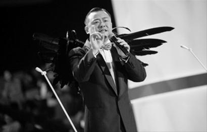 當(dāng)晚,周立波一身筆挺修身的黑西裝在舞臺(tái)上亮相,只不過背后“長”出了一雙黑色的羽毛翅膀,最搞笑的是,他居然提了個(gè)小板凳,然后直挺挺地站了上去,因?yàn)樗車拿琅畟(gè)頭都比他高!拔医裉斓脑煨推鋵(shí)是個(gè)天使,但很多人說我像只烏鴉,但你們別把烏鴉不當(dāng)鳥,別把饅頭不當(dāng)點(diǎn)心!”