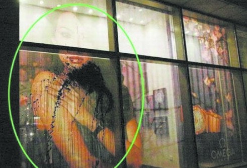 張曼玉沒來,章子怡也只是外出吃飯。正當(dāng)記者們準(zhǔn)備收工時,又一件意外的事情發(fā)生了。23點,一輛黑色奧迪Q 7在酒店門口停了下來,隨后四五個身穿迷彩服、戴著墨鏡的男子從車?yán)镒呦聛磉M(jìn)入酒店大堂詢問保安:“章子怡住幾層?”看到保安未予理會,這幾個人立刻站在酒店大堂內(nèi),用東北話高喊:“大傻X!騙人錢!勾引人老公!”而大約半小時后,這輛車又回到了酒店門前。這次車上下來兩個身穿套頭衫的男子,手里拿著墨汁,走到酒店東側(cè)一間章子怡代言的鉑金店門前,沖櫥窗里的章子怡海報將墨汁潑了上去(見上圖)。隨后,兩人上車,Q 7拉著警報揚長而去。