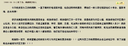 在2008年地震發(fā)生后,北京的同事接到子怡捐100萬的指示后,他們分別給紅十字會捐了兩筆錢。我們當時都不在國內,我也沒盯這事。但在最近兩個星期看到媒體報道說捐款總數(shù)沒有達到100萬,我便開始調查此事。當我尋找捐款收據(jù)時,才發(fā)現(xiàn)一直沒有。今天紅十字會告訴我,捐款的收據(jù)一直在紅十字會那邊,因為他們沒有寄出收據(jù)的地址。當我了解到收據(jù)細節(jié)時,才確認了善款只有84萬元。同時再了解到當時會計和另一個同事她們在各自匯出金額上出現(xiàn)了紕漏,都以為對方匯出了差額。