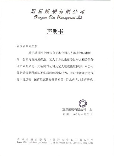 對于近日網(wǎng)上流傳有關(guān)本公司藝人湯唯的口述新聞,全部內(nèi)容純屬捏造,藝人本身從未接受過與之相關(guān)的任何形式的采訪。此新聞對公司及藝人造成極度傷害,本公司強(qiáng)烈譴責(zé)此種編造不實(shí)新聞的惡劣行為,并對此新聞造成的不良影響,保留追究其責(zé)任的權(quán)益,特此聲明,以正視聽。