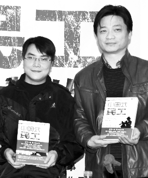 “周述恒指望《中國式民工》的稿酬回家蓋樓,主要就是看沈先生了”。央視著名主持人崔永元邊說邊把話筒遞給了外交部前新聞發(fā)言人、世界知識(shí)出版社總編輯沈國放。沈國放說,“希望大家都來關(guān)注這本書,關(guān)注農(nóng)民工。”4月6日下午,四川籍民工周述恒的《中國式民工》一書的首發(fā)式在王府井書店舉行。