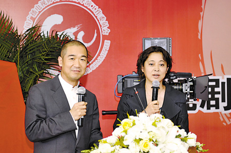 昨天的成立大會更像是一場眾導(dǎo)演的聚會,不少人都身穿便服到場,而主持人倪萍和張國立更是大搞冷幽默。倪萍先把“矛頭”對準(zhǔn)央視:“中央臺影視部的汪國輝主任,你們最招人恨了。到底什么樣的戲能上你們央視呀?今天倒是講講清楚!”接著她話鋒一轉(zhuǎn),又把責(zé)任推給張國立:“這事跟我沒關(guān)系,是張國立教我說的!北弧跋莺Α钡膹垏⒅缓酶尚陕暋䦂鰵夥辗滞廨p松。
