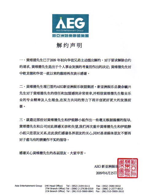 AEG新亞洲娛樂聯(lián)盟集團的聲明指,黃維德先生已于2009 年初向華誼兄弟主動提出解約,對于要求解除合約的請求, 黃維德先生是出于個人事業(yè)發(fā)展的考慮而作出的決定。