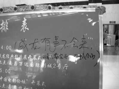 但有趣的是,記者們在電影節(jié)“指定酒店”的大堂信息欄發(fā)現(xiàn)了這樣一行大字:“成龍有事不會來。 ”記者們看后紛紛大笑,并用相機(jī)拍下了這個有意思的畫面,這句話也迅速成為記者圈內(nèi)的一句流行語。記者 于音